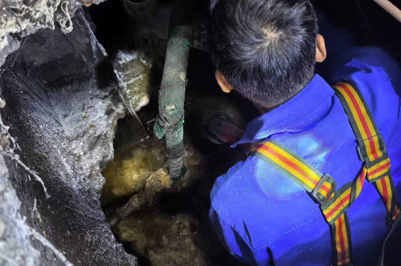 水暖维修部排查食堂地下车库漏水点 水暖维修部为太阳能灯打胶