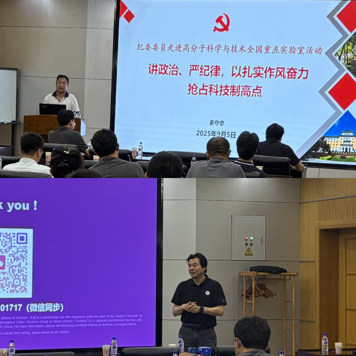 高分子科学与技术全国重点实验室主任门永锋作总结发言,感谢所纪委深入科研一线讲党课、开展纪法教育活动,要求参会科研人员将此次活动所学铭记于心、践之于行,在科研中严守纪律红线,将廉政建设融入科研日常,为我所高质量发展贡献更多力量。